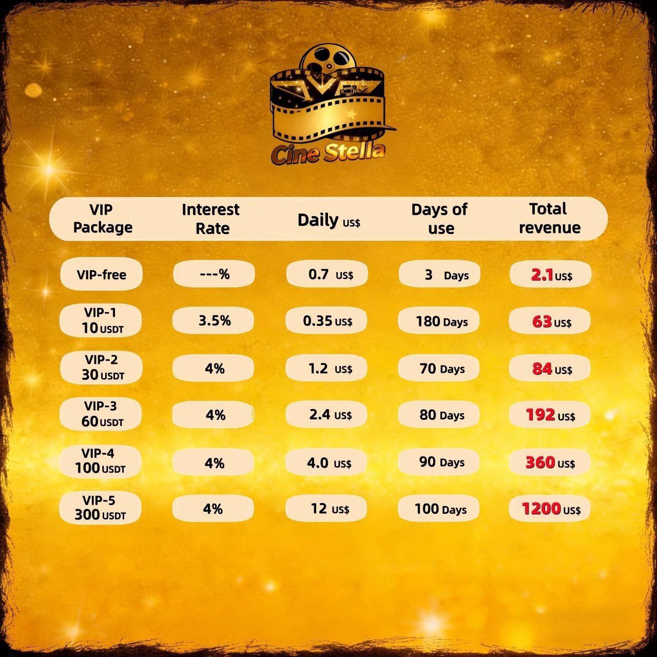 - VIP 5: Инвестируйте 300$ и получайте 12$ ежедневно.